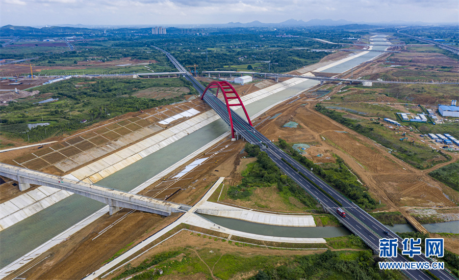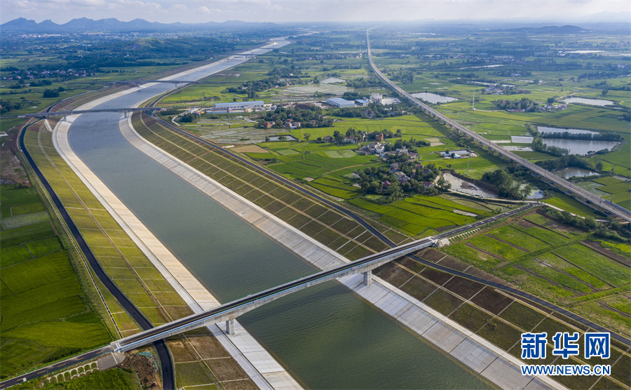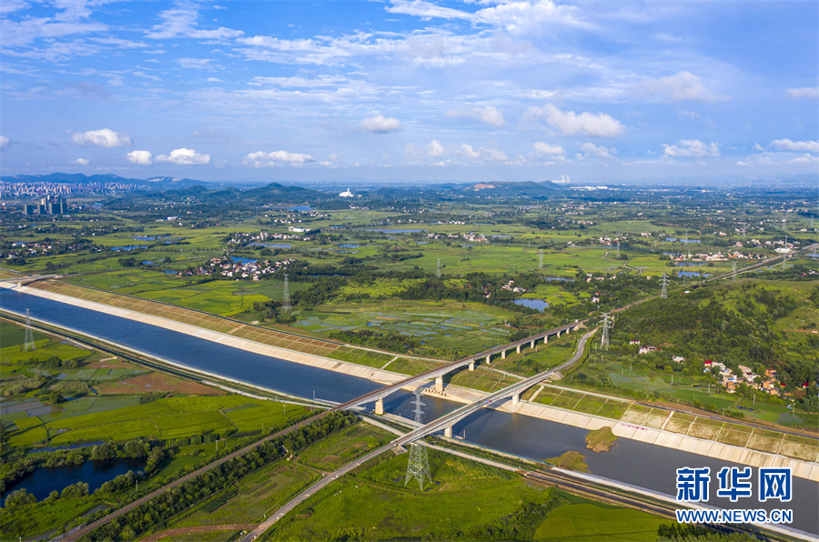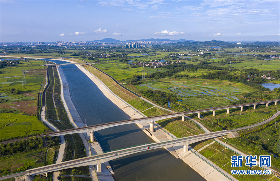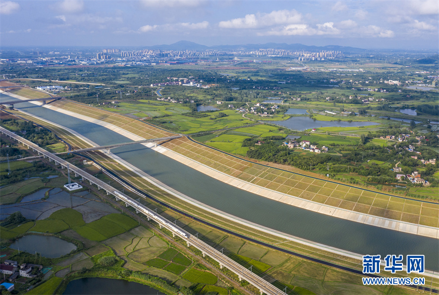 6月28日,安徽省合肥市廬江縣柯坦鎮(zhèn)境內(nèi)的引江濟(jì)淮工程雄姿展現(xiàn),河道、高鐵、公路在綠野中交匯,景美如畫(huà)。